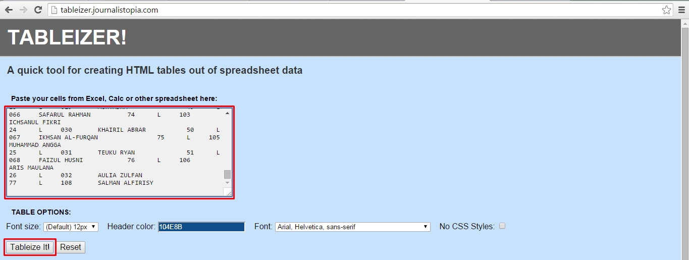 - Buka Situs http://tableizer.journalistopia.com dan pastekan ke dalam kolom yang tersedia seperti gambar di bawah ini dan klik Tableize it!
