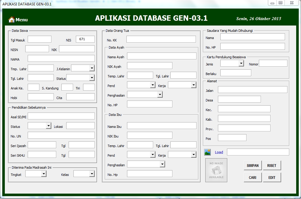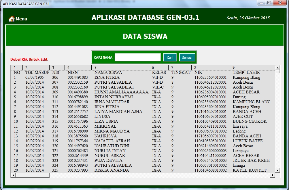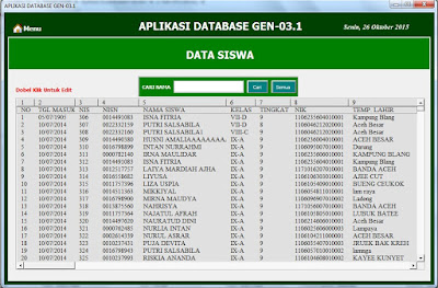 Aplikasi Database Gen-03.1 merupakan aplikasi database untuk madrasah/sekolah yang mencatat biodata siswa lengkap. Aplikasi yang di bangun dengan program VBA Excel ini merupakan Generasi Ke-3 dari 2 generasi sebelumnya dan pengembangan pertama setelah Aplikasi Database Gen-03 yang telah di pakai di MTsS Muta'allimin dan MAS Muta'allimin.